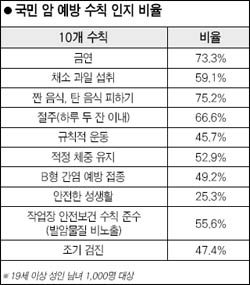 Á¶»ç°á°ú¿¡ µû¸£¸é ÀÀ´äÀÚÀÇ 70% ÀÌ»óÀº ¼öÄ¢ 10°³ Ç׸ñÀ» ½ÇõÇÏ¸é ¾Ï ¿¹¹æÀÌ °¡´ÉÇÏ´Ù´Â Á¡À» ¾Ë°í ÀÖ¾ú´Ù. ÇÏÁö¸¸ '¾ÈÀüÇÑ ¼º»ýȰ'ÀÌ ¾Ï(ÀڱðæºÎ¾Ï, °£¾Ï, Ä«Æ÷½ÃÀ°Á¾, AIDS µî)À» ¿¹¹æÇØÁشٴ °ÍÀ» ÀÎÁöÇϰí ÀÖ´Â »ç¶÷Àº 26%·Î °¡Àå ³·¾Ò´Ù.