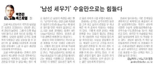 Çö´ë¿¡ µé¾î¿Í¼´Â ÀÌ·± ¹®Á¦µéÀ» °úÇÐÀûÀ̰í ü°èÀûÀ¸·Î ÇØ°áÇϱâ À§ÇÑ ³²¼ºÀÇÇÐÀ̶ó´Â Çй®ÀÌ ´ëµÎµÅ ´Ù¾çÇÑ ¼ö¼úÀû ¹æ¹ý(À½°æÈ®´ë¼ö¼ú¡¤Á¶·ç¼ö¼ú¡¤¹«µµÁ¤°ü¼ö¼ú µî)ÀÌ °³¹ßµÇ°í ÀÖ´Ù. ÇÏÁö¸¸ ÀÌ ¼ö¼ú¹ýÀ» ¿å½É ¸¹Àº ³²¼ºµé¿¡°Ô ¸ðµÎ ´Ù Àû¿ëÇÒ ¼ö´Â ¾ø´Ù. Á¤¸»·Î ÇÊ¿äÇÑ,±â Á×Àº ³²¼ºµé¿¡°Ô¸¸ ¼±ÅÃÀûÀ¸·Î Àû¿ëµÅ¾ß ÇÑ´Ù. ÀÌÁ¦ ³²¼ºµéÀº ¿¾³¯ÀÇ ¹Ì°³ÇÑ ¹æ¹ý ´ë½Å °úÇÐÀûÀ̰í ÀÇÇÐÀûÀÎ ¹æ¹ýÀ¸·Î ÇØ°áÇÒ ¼ö ÀÖ´Â ¼±ÅÃÀÇ ÆøÀÌ ±×¸¸Å ³Ð¾îÁø °ÍÀÌ´Ù.